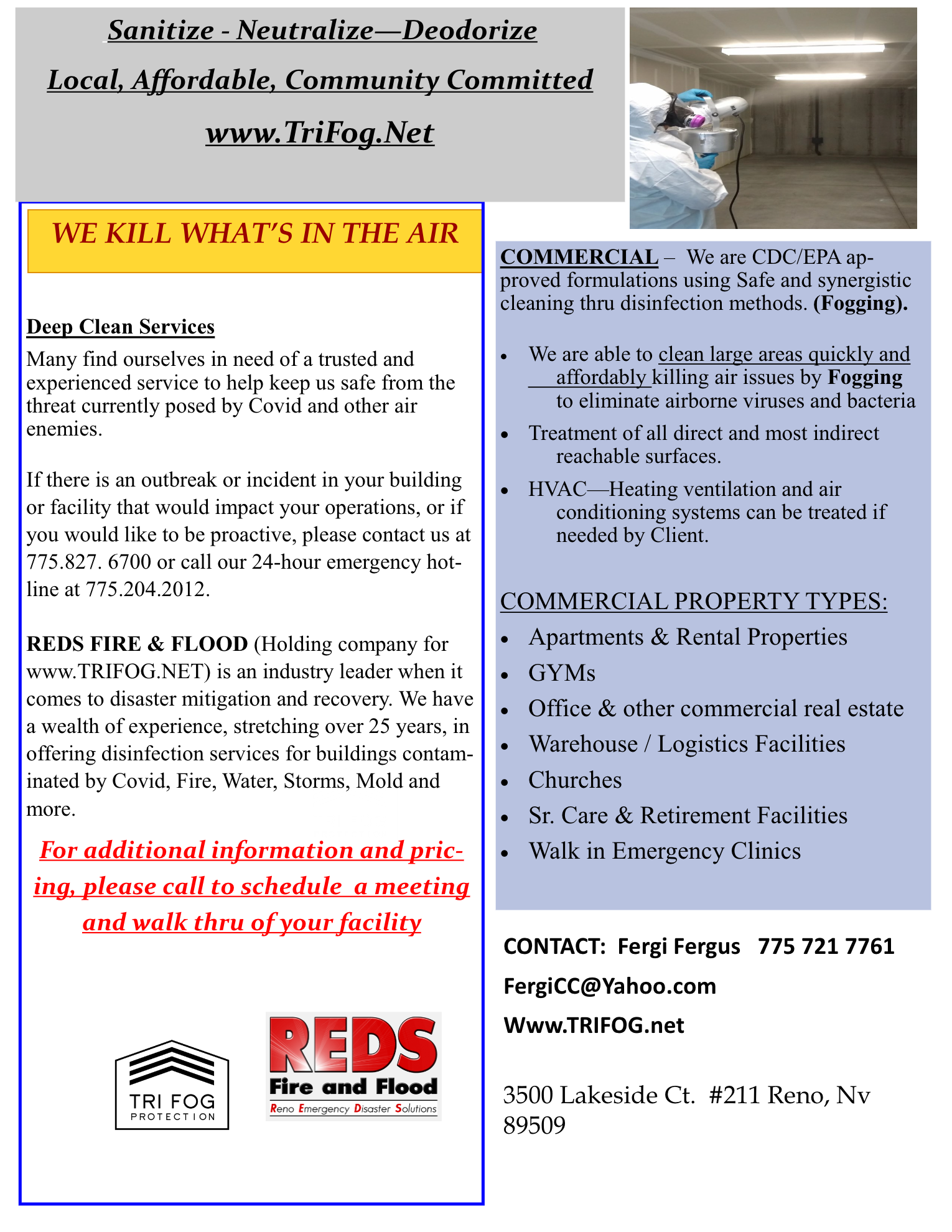 • REDS FIRE & FLOOD (Holding company for Tri Fog) is an industry leader when it comes to disaster mitigation and recovery. We have a wealth of experience, stretching over 25 years, in offering disinfection services for buildings contaminated by fire, water, storms, mold and more.
